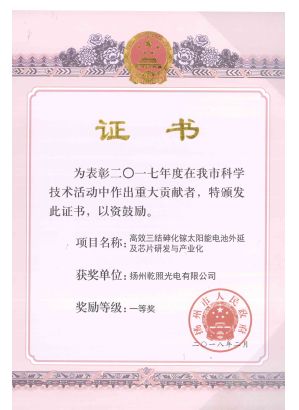 日前,揚州市政府公布了2017年度科學技術獎獲獎情況。揚州乾照光電有限公司申報的“高效三結砷化鎵太陽電池外延及芯片研發與產業化”項目,在眾多優秀成果中脫穎而出,榮獲揚州市科技進步獎一等獎。
