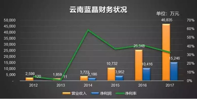 從公開的歷年中報數據上看,并購后,云南藍晶的主營收入和凈利潤逐年大幅攀升,其他方面也表現突出,例如,毛利率基本維持在40%左右,凈利率也在25%以上,給華燦光電增色不少。