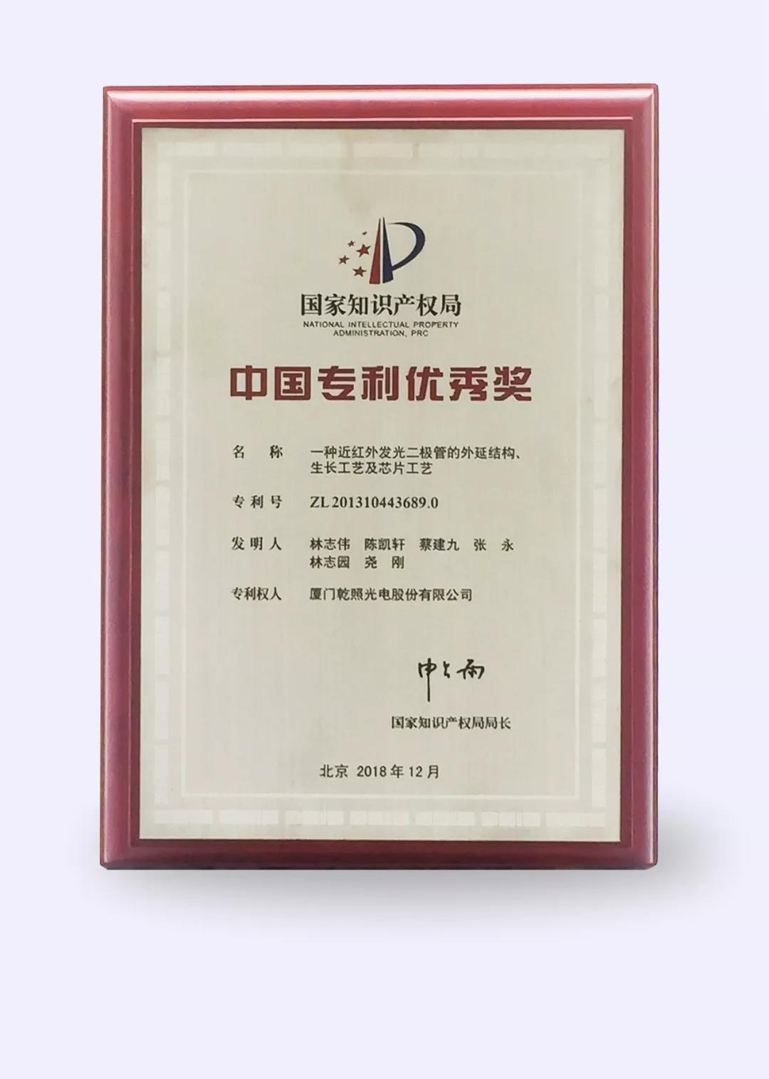 2018年歲末,國家知識產權局公布了第二十屆中國專利獎獲獎名單。其中,廈門乾照光電股份有限公司的發明專利《一種近紅外發光二極管的外延結構、生長工藝及芯片工藝》(專利號:ZL201310443689.0)榮獲第二十屆中國專利優秀獎。