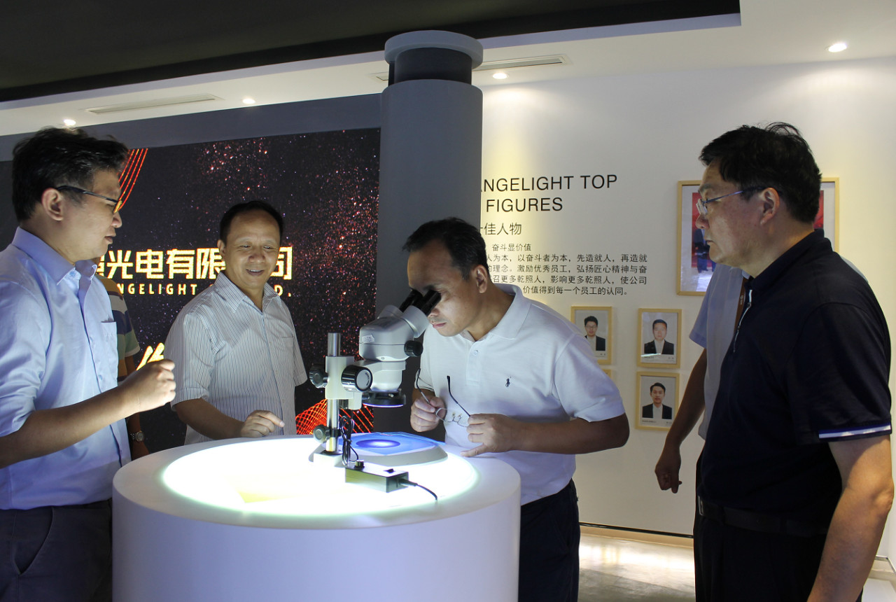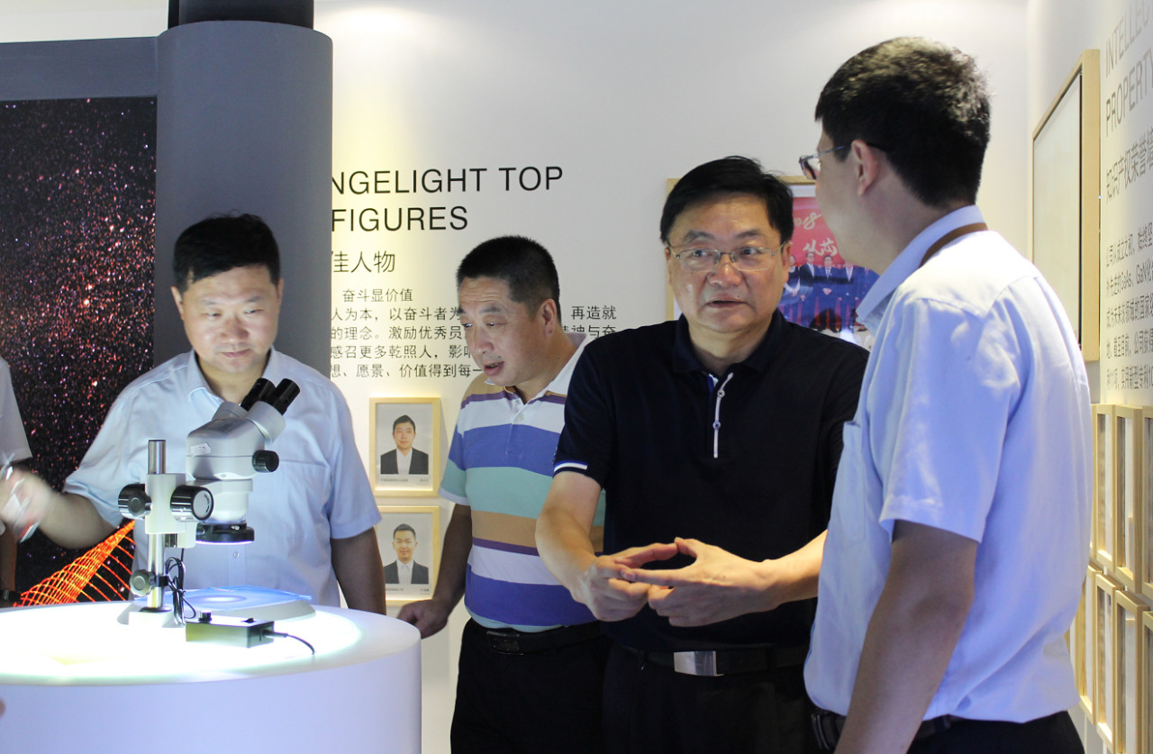 隨后,巡視組一行參觀了公司展廳。馬祥柱為大家講述了揚州乾照光電創業十年的歷程、成績以及榮譽,并介紹了公司各類產品的型號、樣式以及應用領域。巡視組成員們通過顯微鏡觀察了公司芯片成品芯粒,對一片四寸圓片能切出幾十萬顆芯粒的生產工藝贊嘆不已。