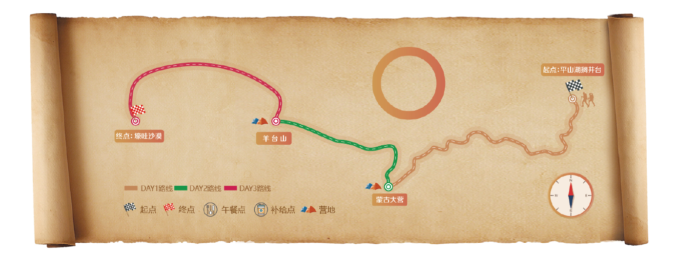 征途從平山湖擱井臺出發,以沙坡小鎮、羊臺山為營地,最終到達壕哇沙漠,縱穿丹霞、濕地、戈壁、沙漠四大險峻地貌。
