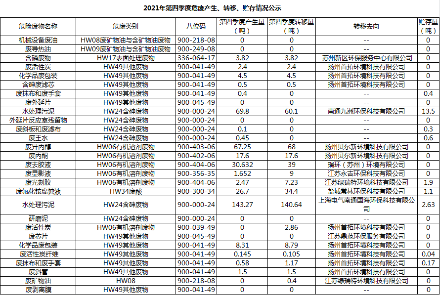揚州乾照光電有限公司2021年第四季度危廢產生、轉移、貯存情況公示