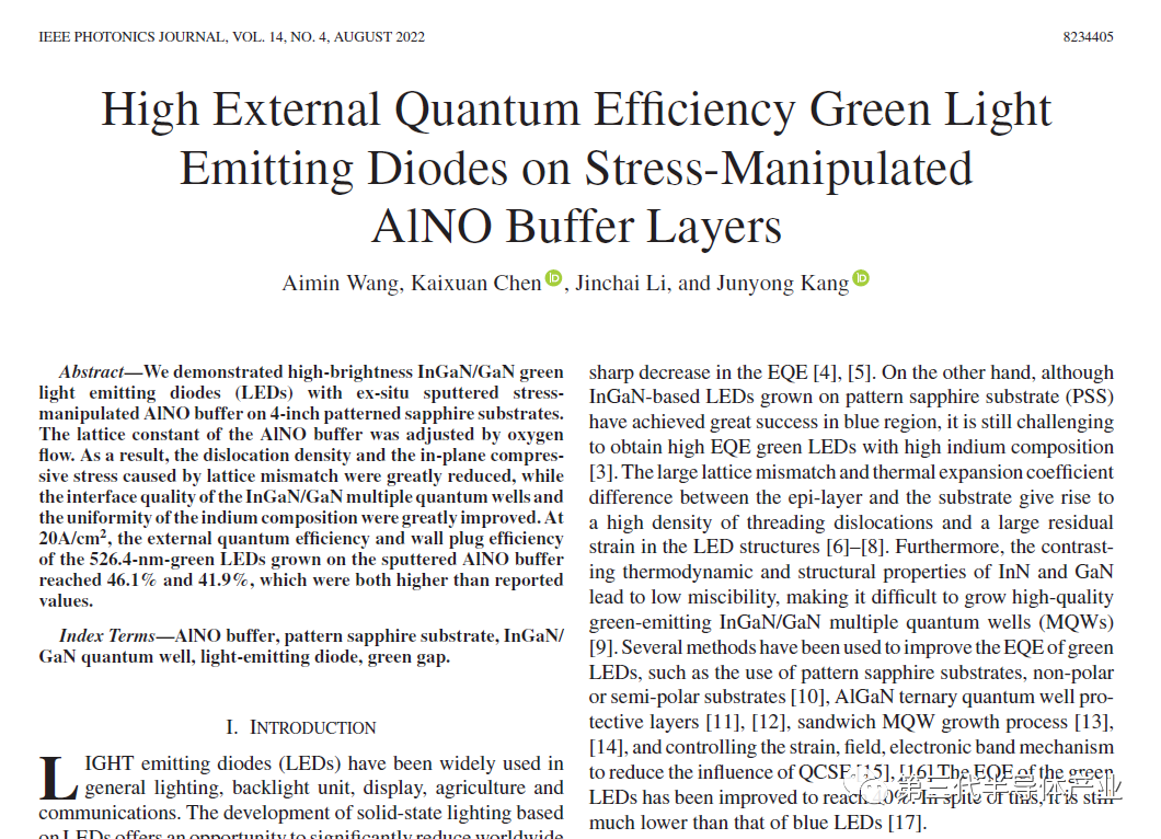 近日,廈門大學物理科學與技術學院與乾照光電協同攻關,在提升綠光LED效率方面取得重大進展。該研究成果以“High External Quantum Efficiency Green Light Emitting Diodes on Stress-Manipulated AlNO Buffer Layers”為題發表于IEEE PHOTonICS JOURNAL 14(4) (2022) 8234405。