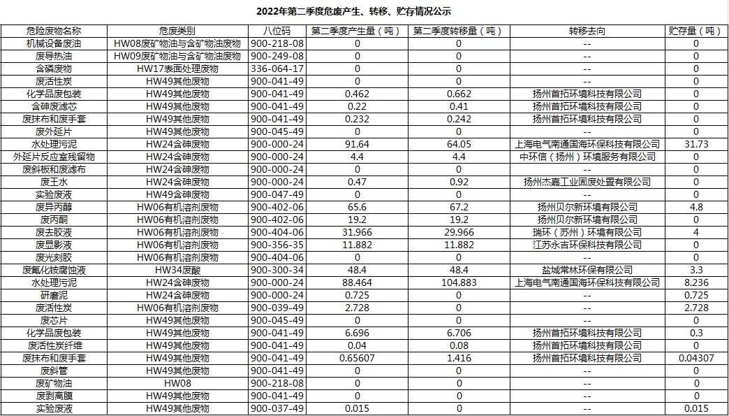 揚州乾照光電有限公司2022年第二季度危廢產生、轉移、貯存情況公示