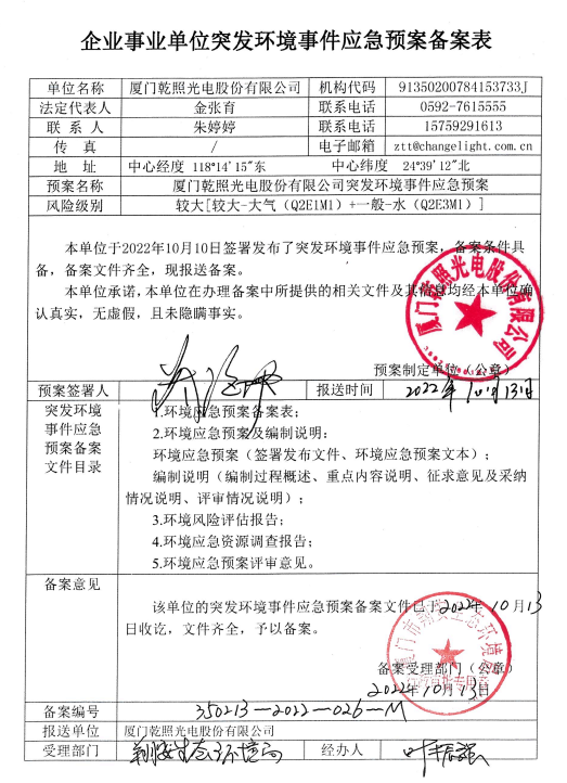 廈門乾照光電股份有限公司突發(fā)環(huán)境事件應(yīng)急預(yù)案公示 來源: 發(fā)布時(shí)間:2022-10-20 附件:廈門乾照光電股份有限公司突發(fā)環(huán)境事件應(yīng)急預(yù)案