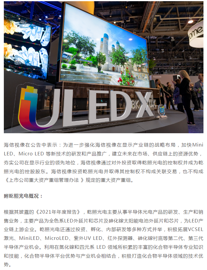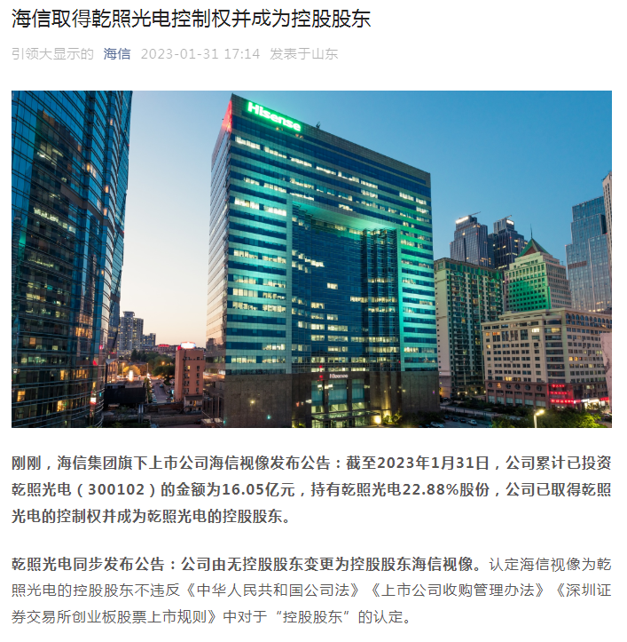 2023年1月31日,海信視像與乾照光電共同發布公告,認定海信視像為乾照光電的控股股東。