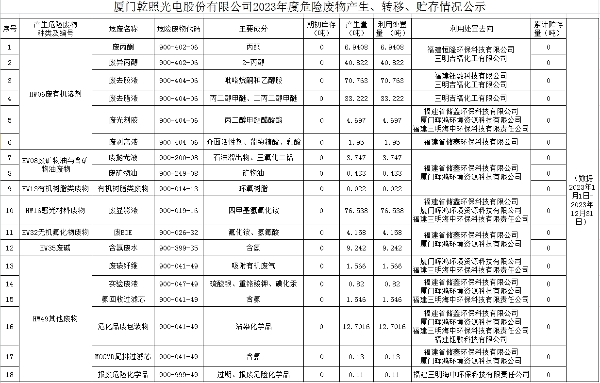 廈門乾照光電股份有限公司2023年度危險廢物產生、轉移、貯存情況公示