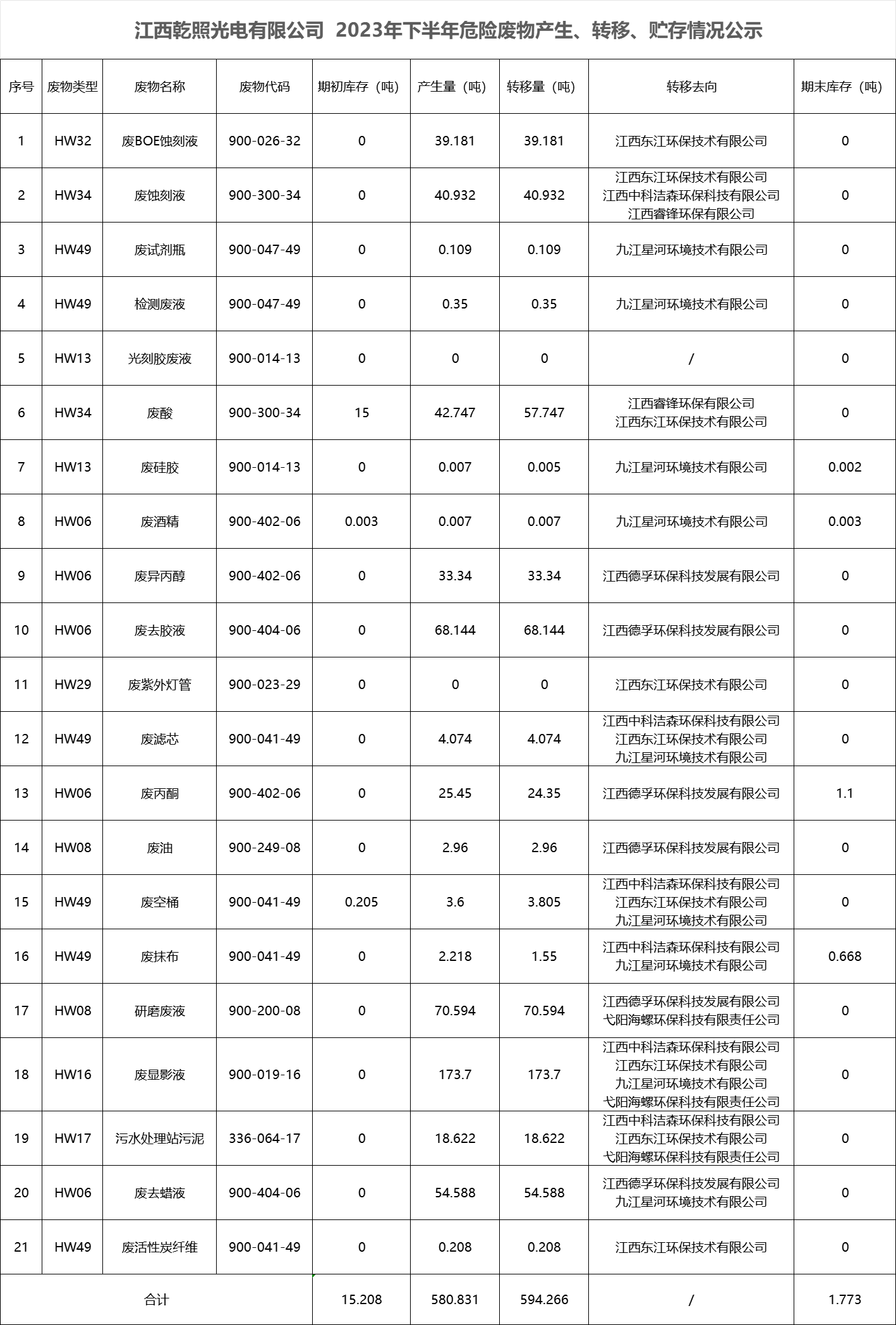 江西乾照光電有限公司 2023年下半年危險廢物產生、轉移、貯存情況公示