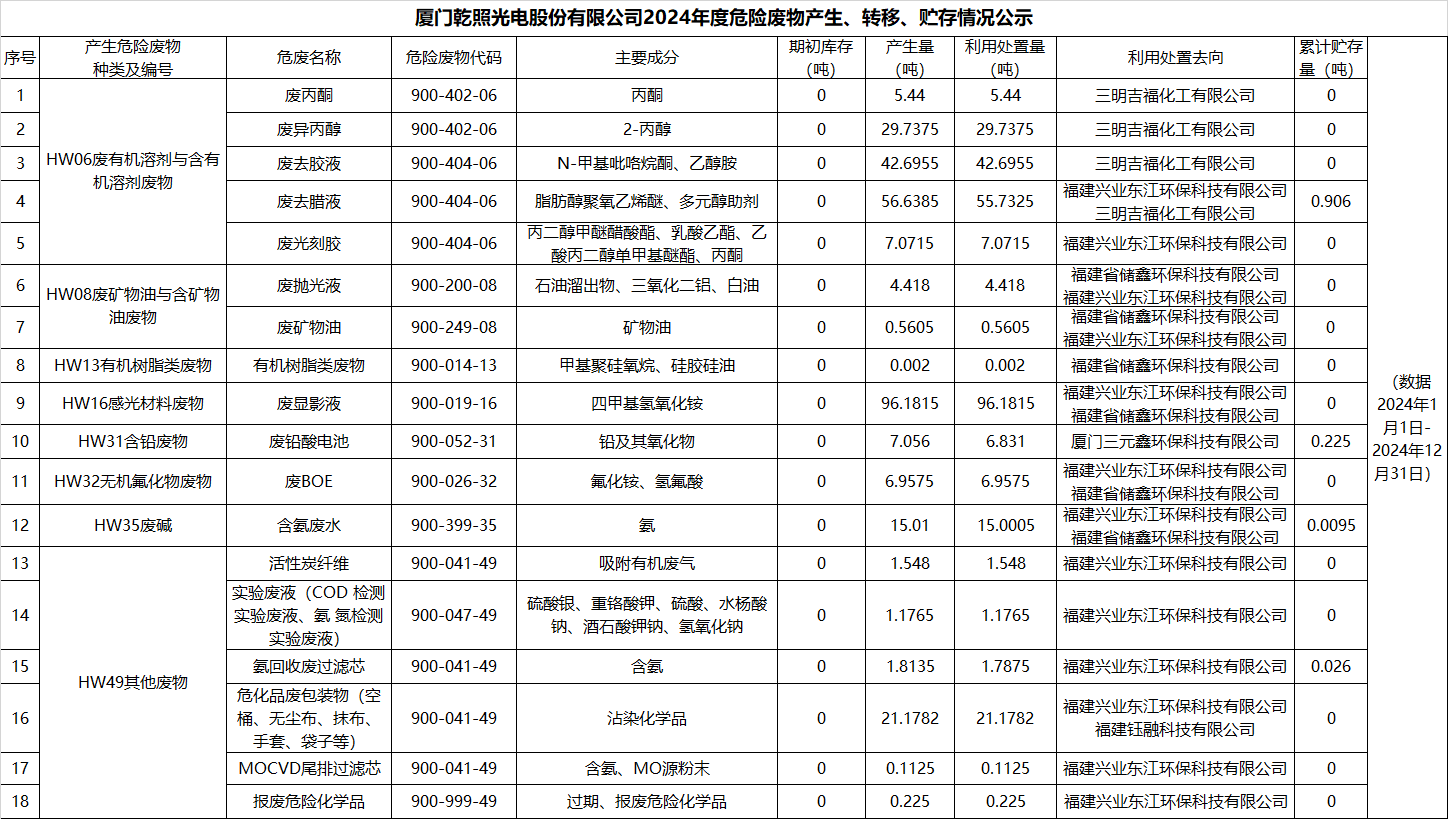 廈門乾照光電股份有限公司2024年度危險廢物產生、轉移、貯存情況公示
