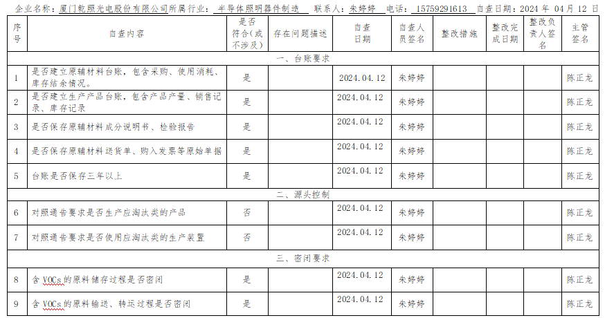 廈門市揮發性有機物污染防治企業自查表(本企業對表格數據內容負責) 企業名稱:廈門乾照光電股份有限公司所屬行業:半導體照明器件制造 聯系人:朱婷婷 電話:15759291613自查日期:2024年04月12日 ...