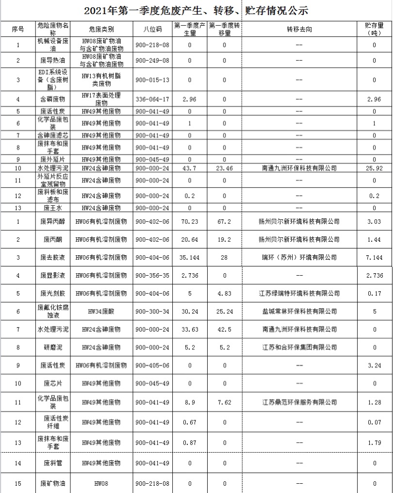 揚州乾照光電有限公司2021年第一季度危廢產(chǎn)生、轉(zhuǎn)移、貯存情況公示